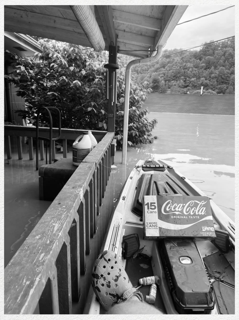 Rain was continuing to fall, and supplies were getting limited, if nothing was done, the family would soon go cold. Casey then made the courageous decision to swim back down into their now flooded home and collect clean clothes, food, and more blankets in order to keep their kids warm. What he also came back with, was the two family kayaks, and a single paddle. It was the only one he could find.